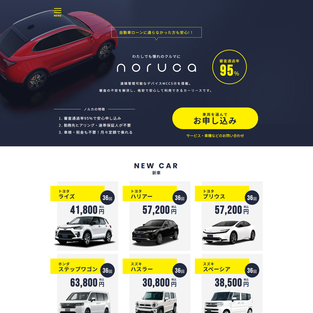 - 連帯保証人が不要で気軽に申し込みできる◎人気車種や新車のリースも可能